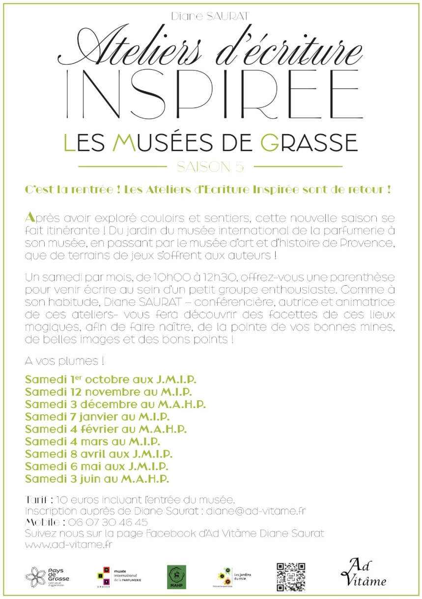 Atelier d'écriture au Musée International de la Parfumerie, session culture et insertion. Hôpital du Petit Paris à Grasse et à l’école de cirque « Piste d’Azur », la Roquette sur Siagne.
